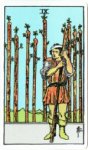Examples of stage cards are (from left to right below) the 10 of cups, 10 of Wands, 2 of cups, 4 of wands, 5 of swords, 9 of wands, 2 of swords, 7 of swords, 8 of pentacles, 6 of pentacles, page of cups and 2 of pentacles.